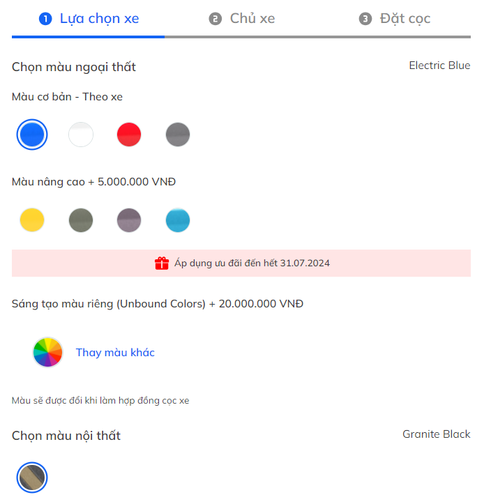 Khách hàng đặt mua VF 5 Plus màu nâng cao sẽ được ưu đãi 50% chi phí chọn màu sơn.